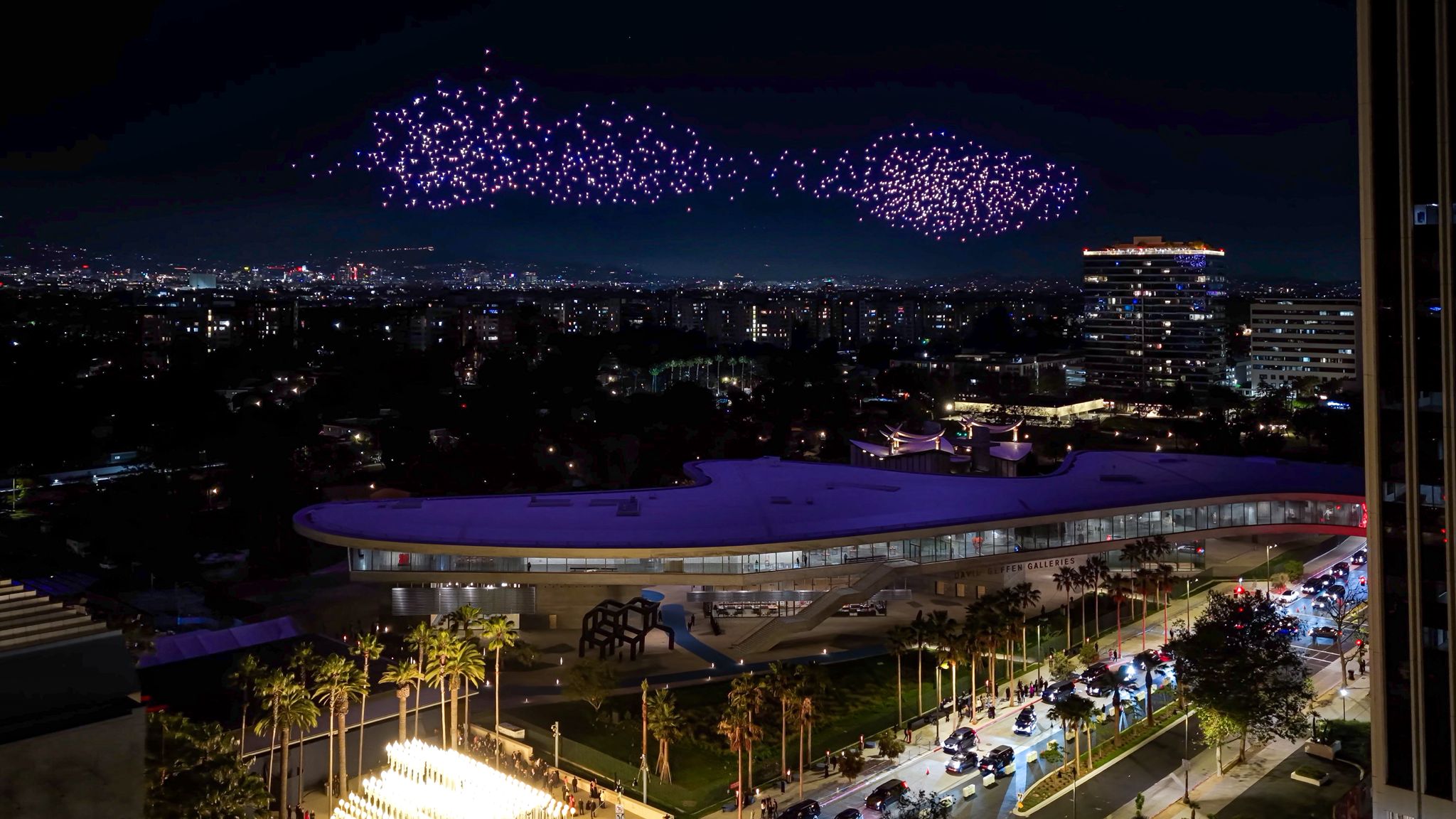 Last week, Dutch art-duo DRIFT presented Franchise Freedom, the studio’s iconic drone performance, to celebrate the opening of the new David Geffen Galleries at the Los Angeles County Museum of Art (LACMA). In the heart of Los Angeles, where the evening light stretches across Wilshire Boulevard, two distinct yet deeply connected visions of form, movement, and public space came into focus: one expressed through the monumental, sand-colored concrete of the David Geffen Galleries, the other through a choreographed constellation of illuminated drones guided by DRIFT’s swarming algorithms.